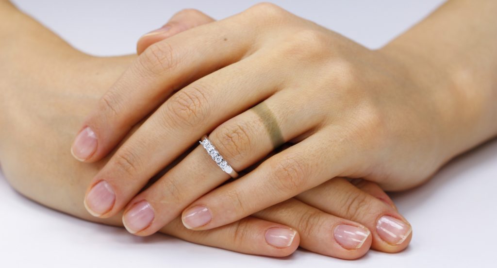 What is your ring made of? You are convinced you purchased a genuine gold ring, so why is it turning your finger black? Even authentically gold rings can do this to the best of us. Let’s start by understanding what rings are made of. Gold is measured using the term karat (kt), which is different than how diamonds are described using the term carat. Pure gold is 24 kt, yet jewelers don’t use pure gold because it is too soft. In order to make pure gold more workable and stronger, other metals are alloyed in. Metals such as zinc, nickel, silver and copper are added in to create an alloyed metal that will be workable and stronger for long-lasting wearability. If your ring is 18 kt gold, or 18/24 kt, that means that 75% is 24 kt yellow gold and the other 25% are other alloy metals. If you ring is 14 kt gold, or 14/24 kt, that means that 58% of the ring is 24 kt yellow gold and the other 42% are other alloy metals. If you have white gold, white metals are added in, if you have rose gold, copper dominates the other alloys.